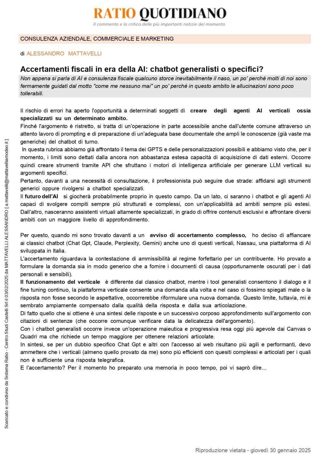 Buongiorno Simone lunedì 3 novembre sarò nel tuo ufficio per un po’ di formazione e soprattutto per sottoscrivere l’offerta commerciale dei vari strumenti perciò stamattina ho “testato” Nassau con una BANALE domanda. Quello che ha proposto mi ha soddisfatto pienamente; ha analizzando la situazione in 43 pagine. Stessa domanda fatta ad altre AI a mia disposizione che hanno “risolto” la questione con 2 o massimo 5 pagine. Non ritengo che tu abbia bisogno di ulteriori conferme sulla validità dello strumento ma avevo piacere di dirtelo anche perché sei una persona ammirevole per i trattamenti che mi hai riservato. Buona giornata. Sonia